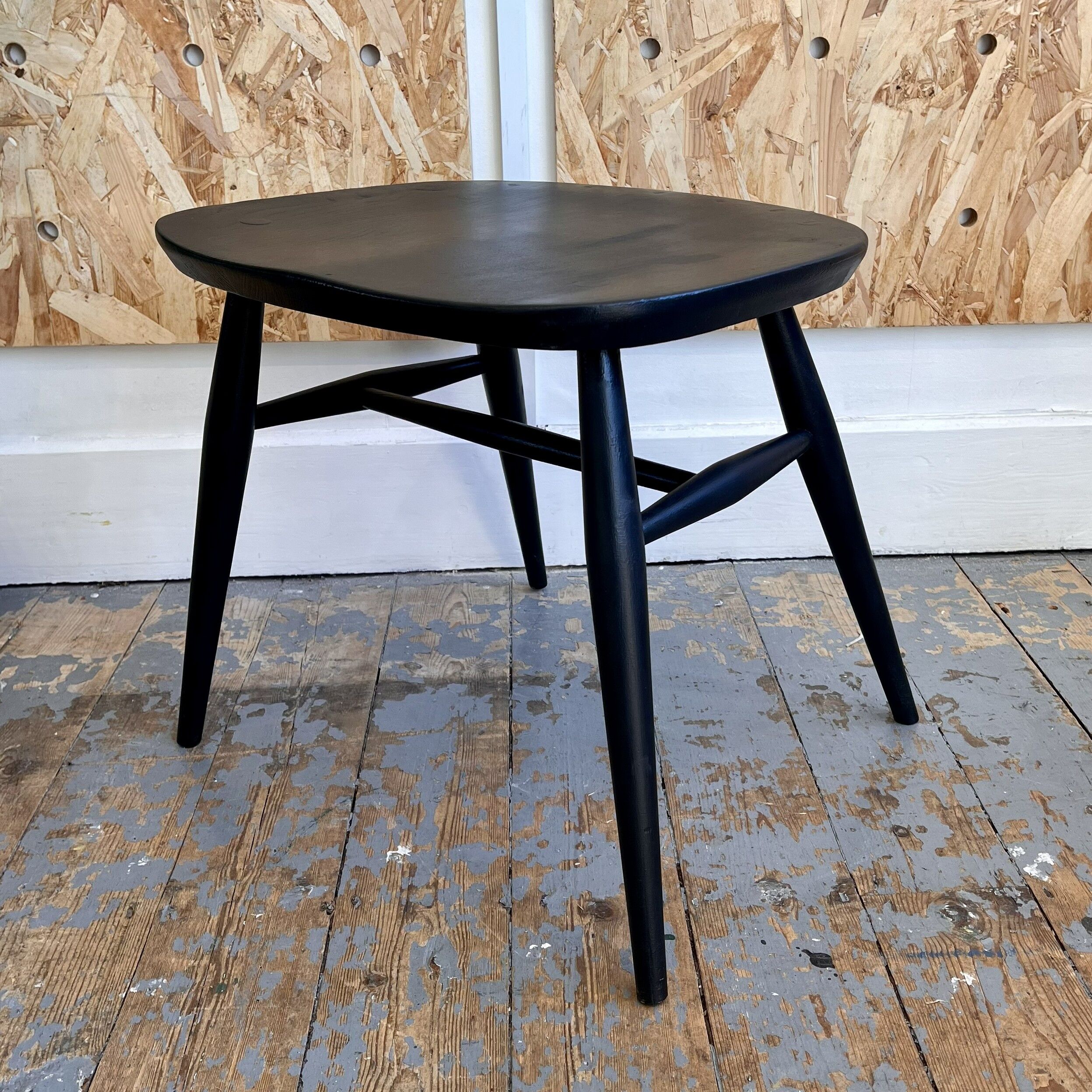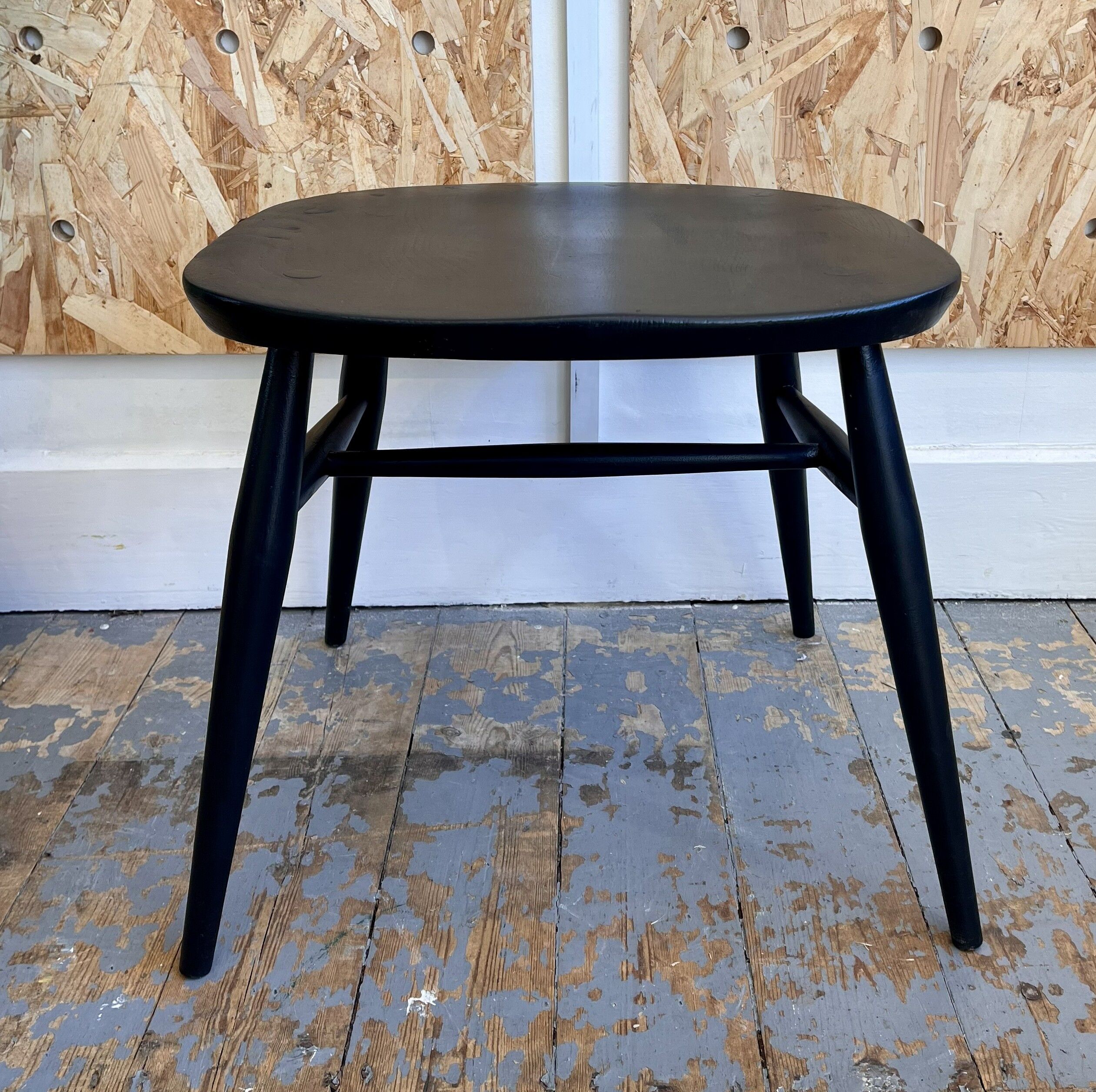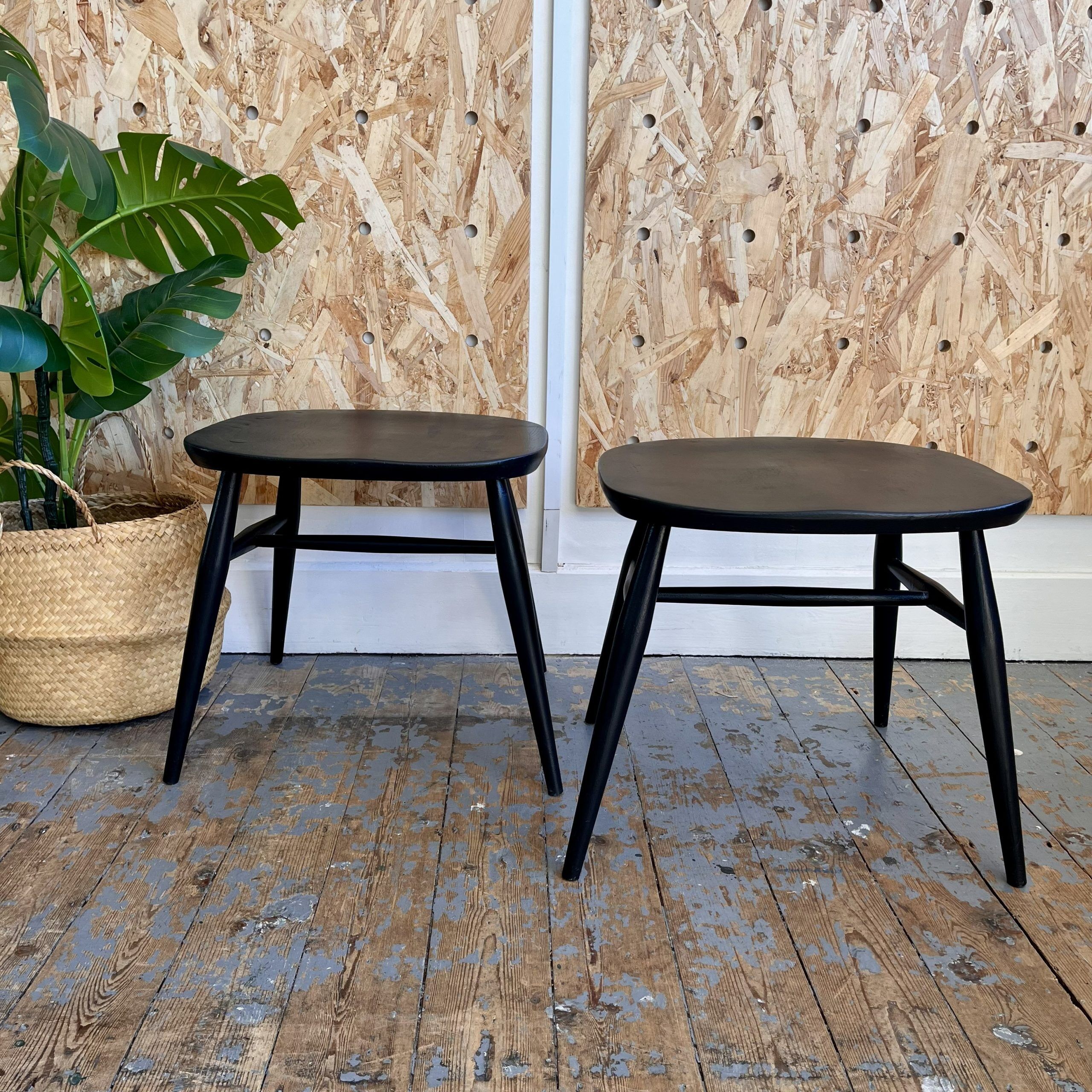 These unique, elegant black stools are a perfect example of timeless Mid-Century Modern design. Having started life as a pair of Ercol Bow back chairs, each piece has been carefully repurposed to highlight its sleek lines and tapered legs. The deep satin black finish offers a sophisticated touch that complements any contemporary home.
