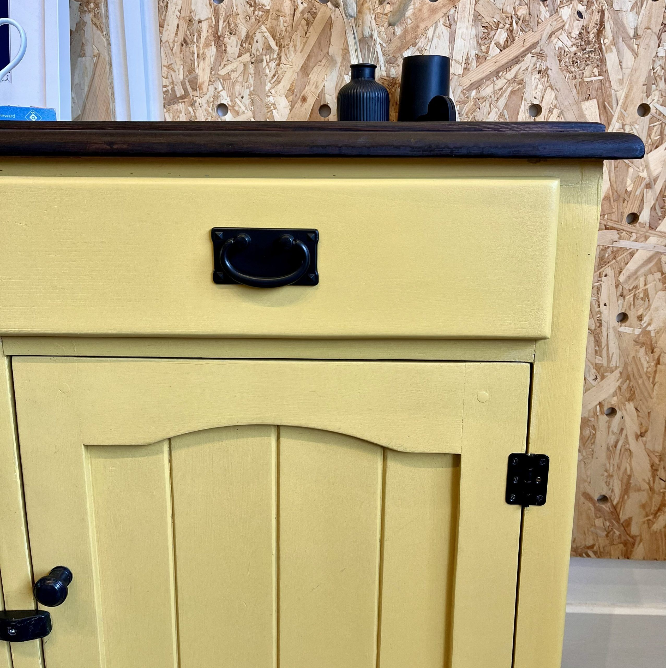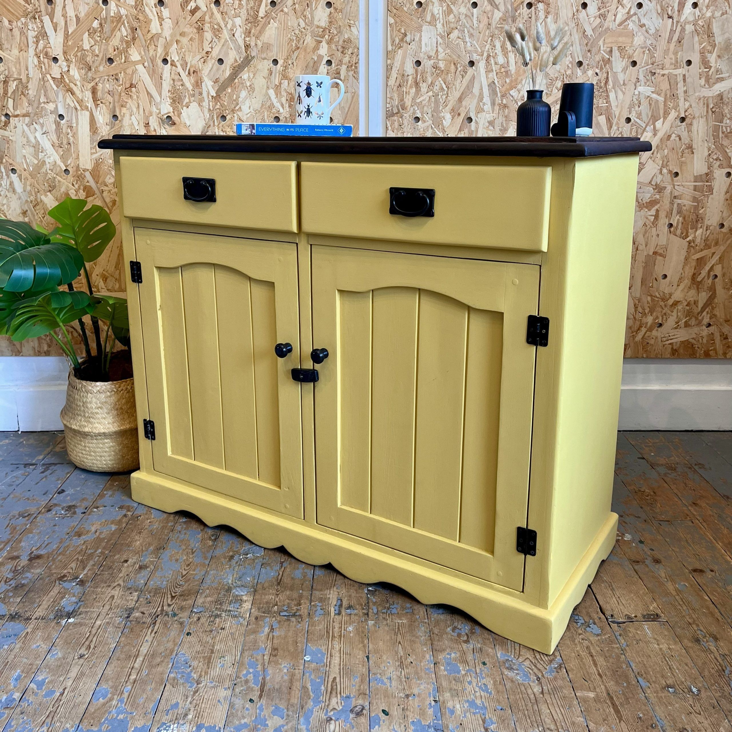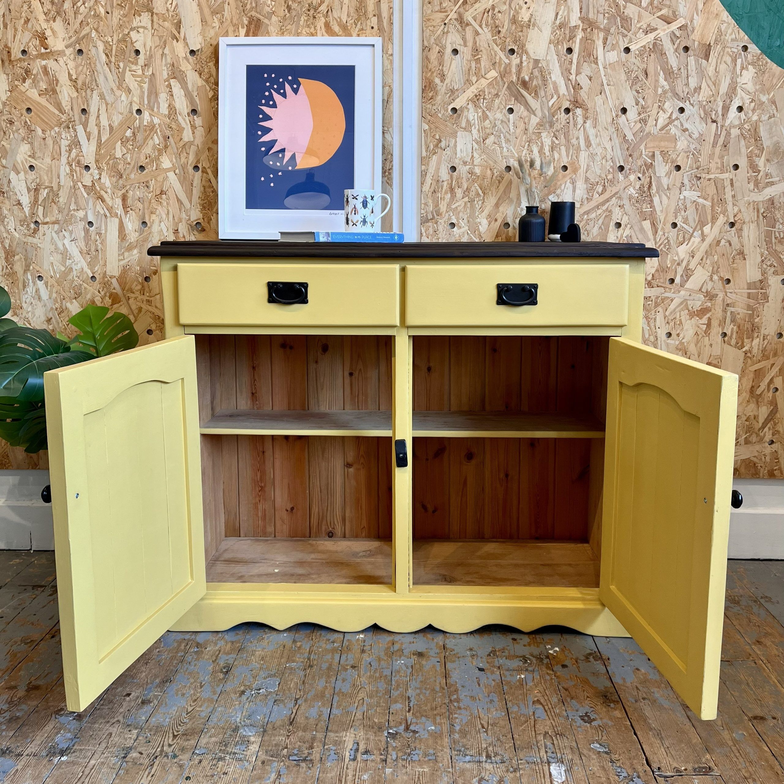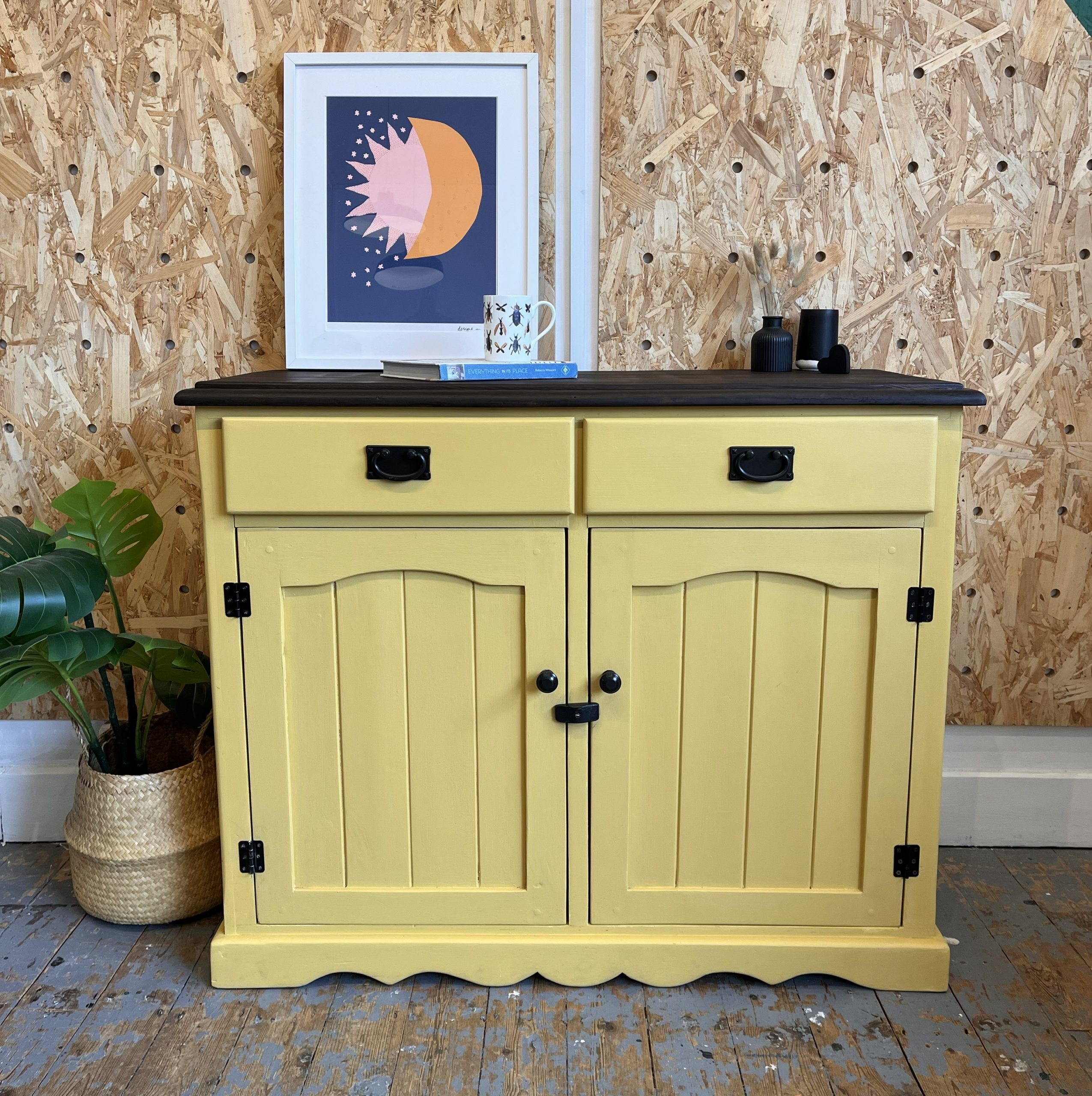 Bring a splash of sunshine to your home with this striking mustard yellow sideboard. This piece features a rich dark wood top and contrasting black hardware for a bold, modern look. The design is inspired by the classic country style of the mid 20th century. It offers two spacious drawers and a large cupboard for all your storage needs.