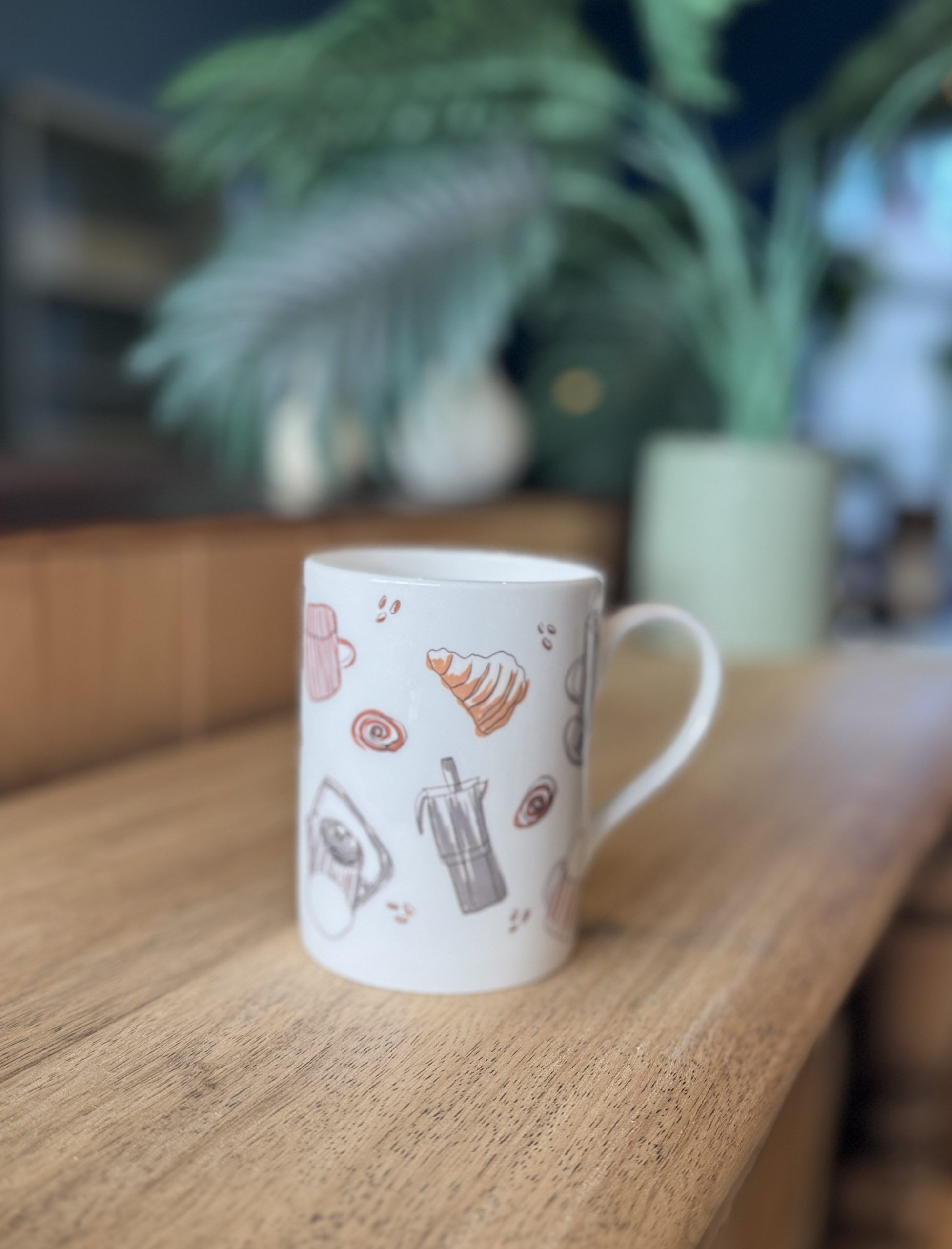 A fine bone China mug decorated with a print designed by the adults with learning disabilities and / or autism at Nickel Support