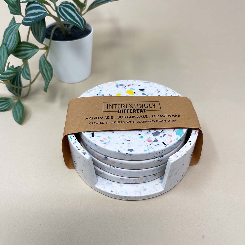 Add a pop of color to your home with these stunning terrazzo-style coasters. Each piece is carefully handmade from eco-friendly resin by our talented team, providing meaningful opportunities for adults with learning disabilities.