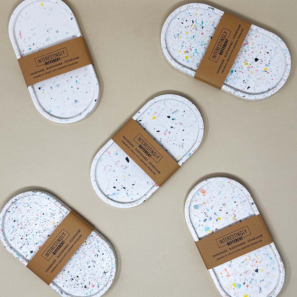Brighten your home with our beautiful Jesmonite oval dish. Each piece is handmade carefully by our team, providing empowering opportunities for adults with learning disabilities to craft high-quality, eco-friendly resin homeware for you.