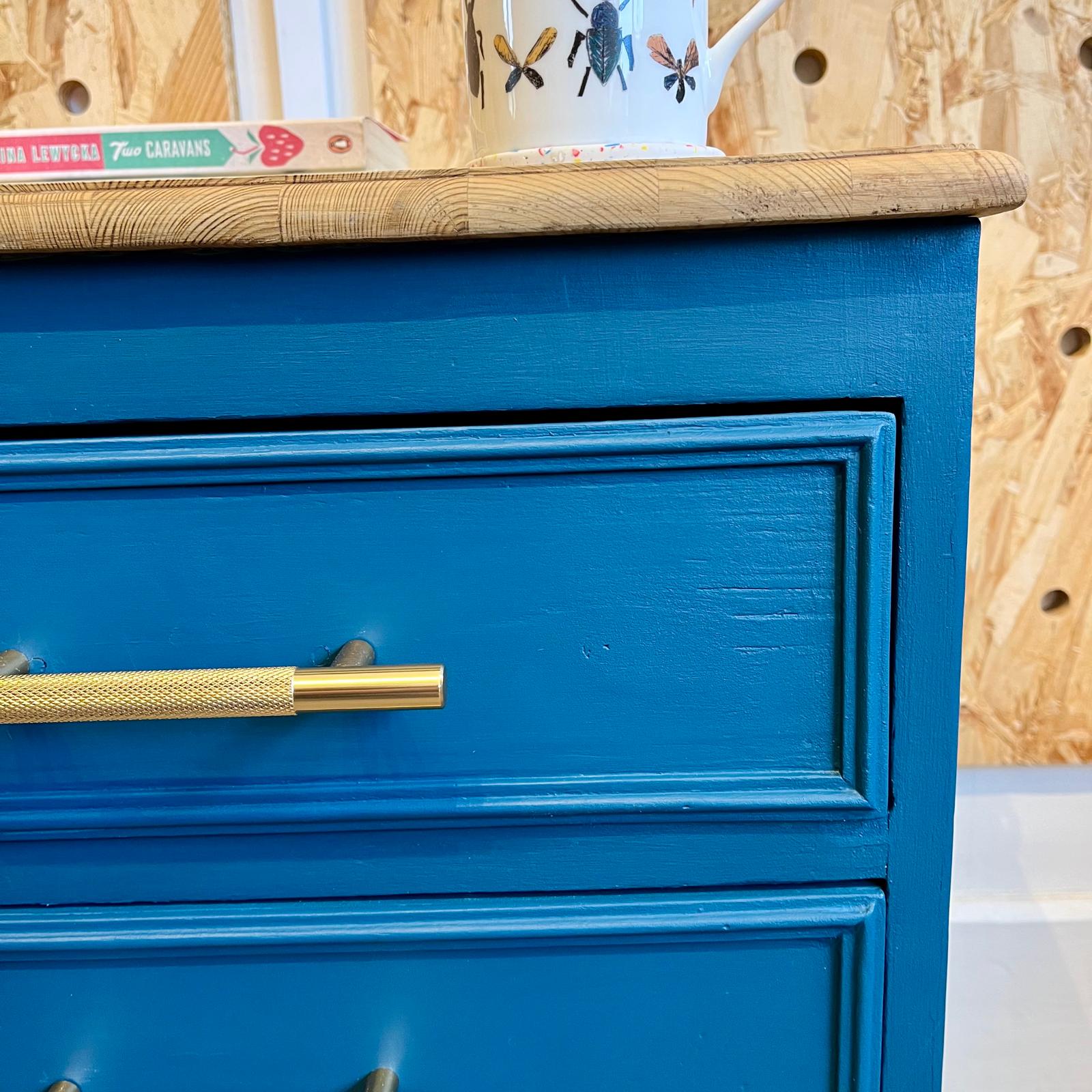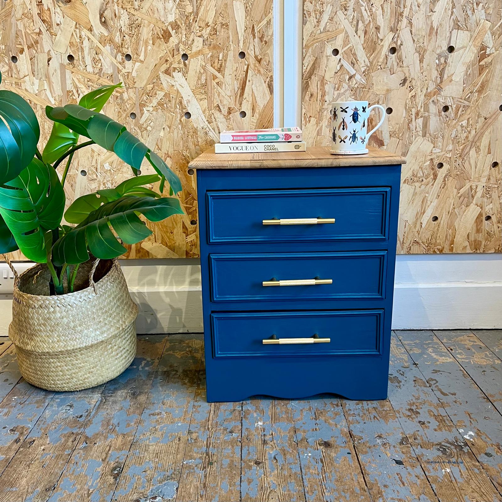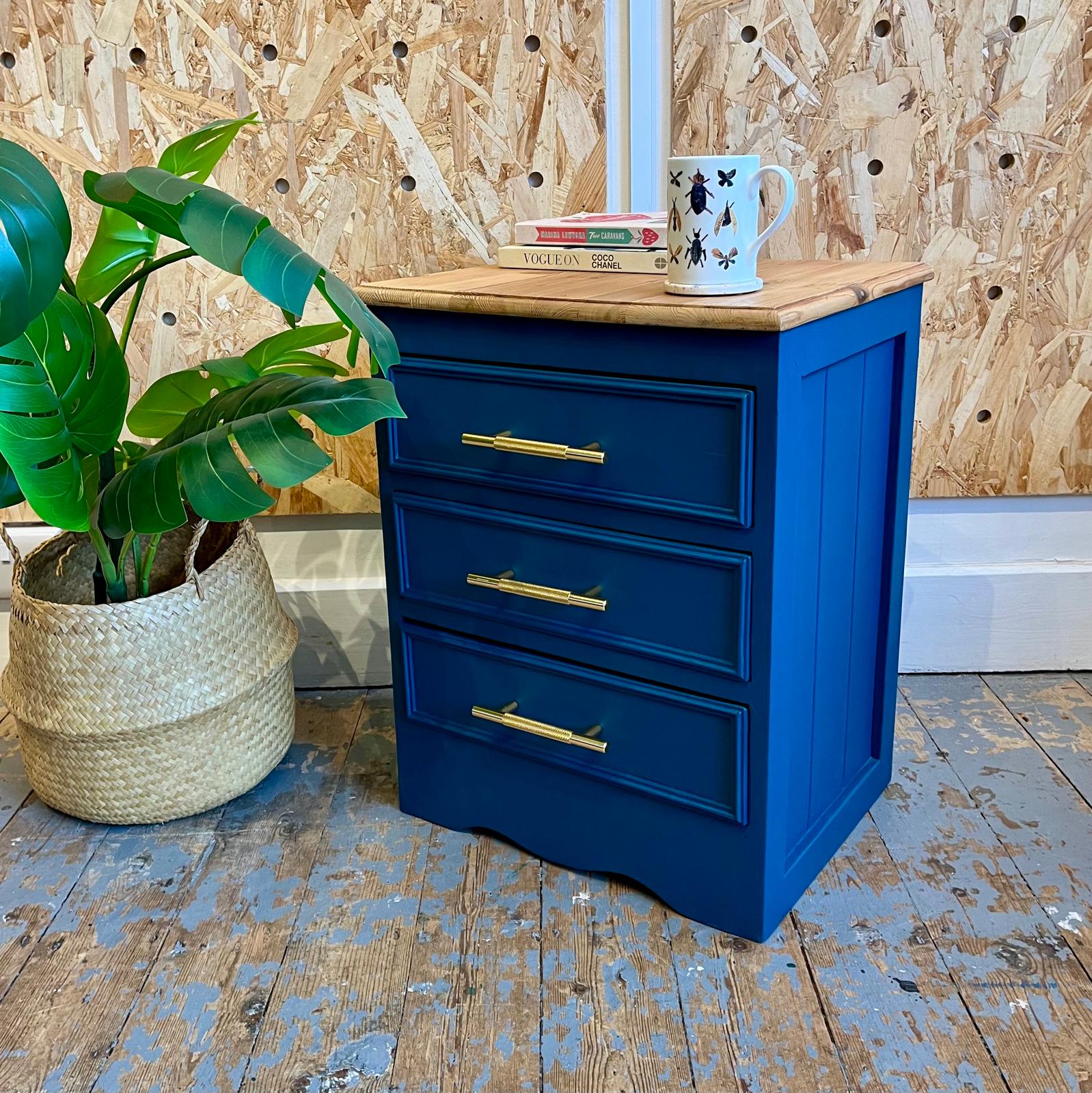 This vintage mid-century modern bedside chest has been expertly reimagined for the contemporary home. It features three spacious drawers finished in a deep, sophisticated navy blue. The rich paint is beautifully offset by a natural wood top and elegant gold T-bar handles.