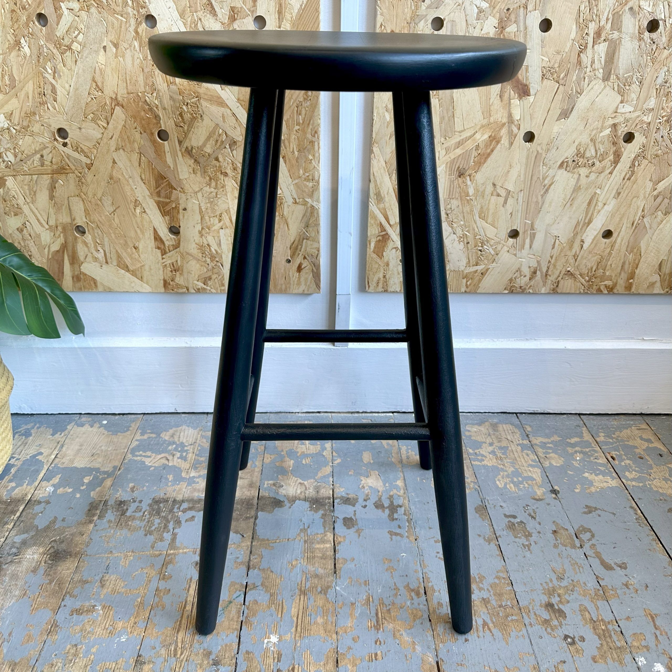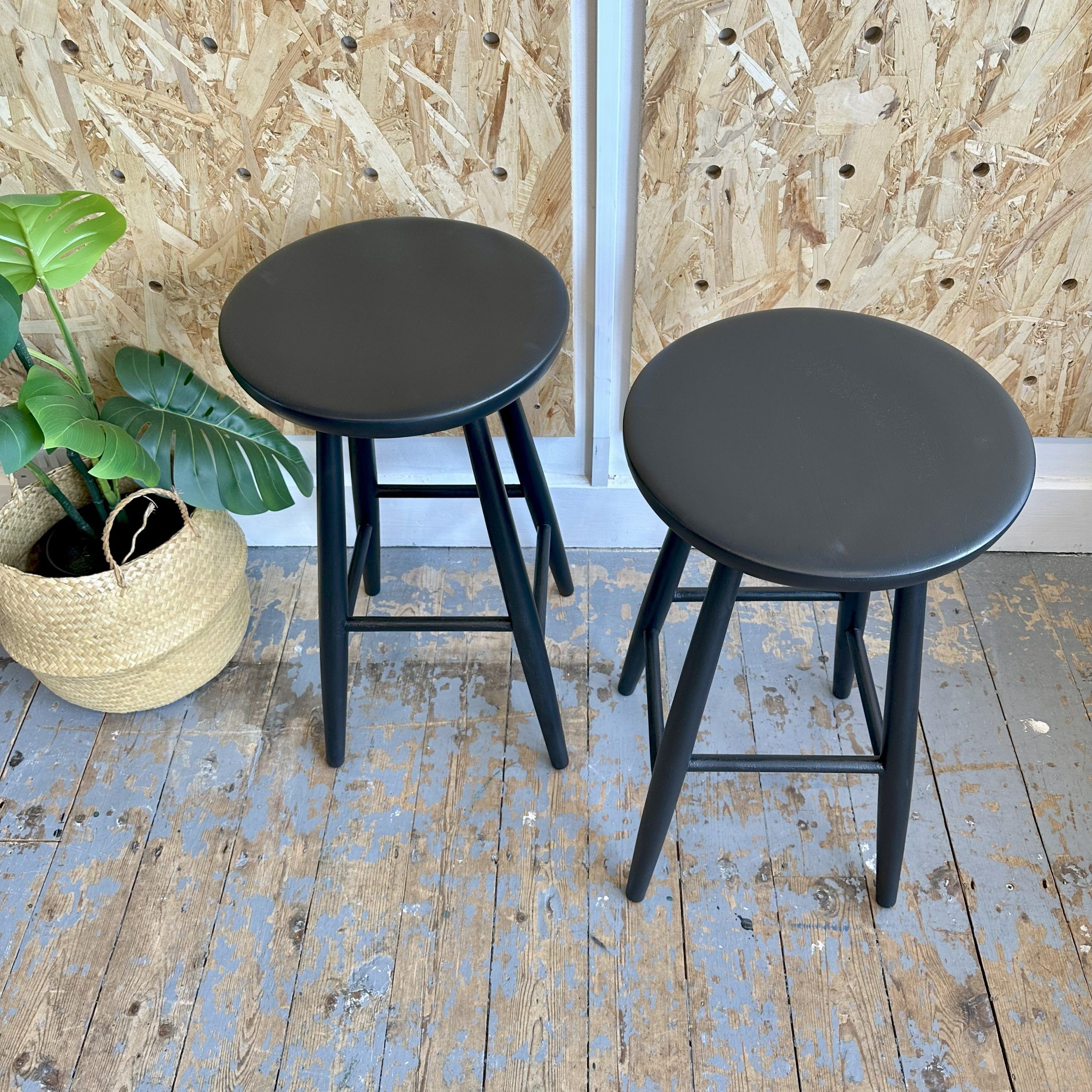 Freshen up that breakfast bar with our  pair of contemporary kitchen stools. The simplest elegance of the design is enhanced having been painted in a sleek satin black. Upcycled by the adults with learning disabilities and / or autism at NICKEL SUPPORT