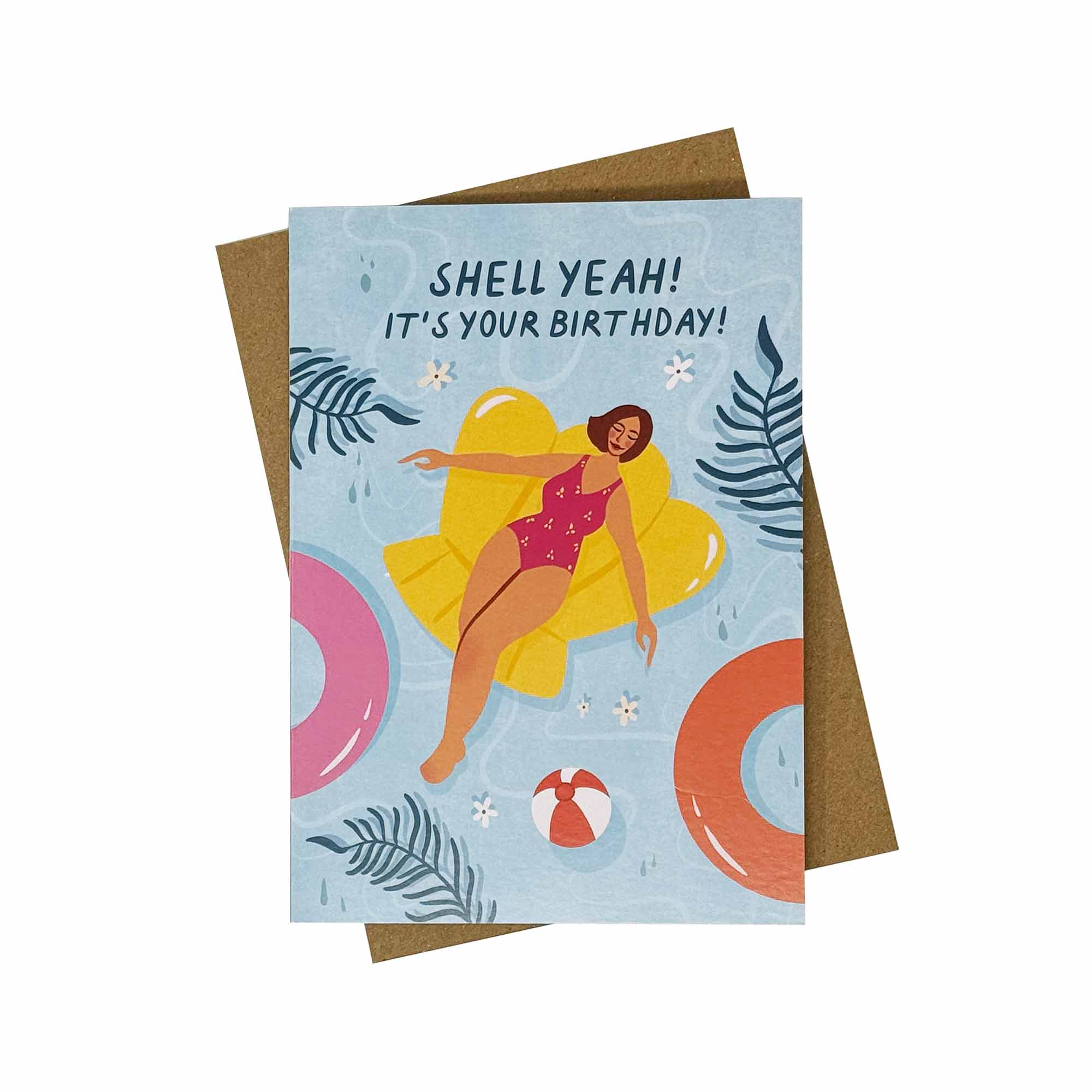 Send a loved one some birthday wishes with this summer pool party-themed card. Featuring a woman relaxing on a pool float with the quote ‘Shell yeah! It’s your birthday!’