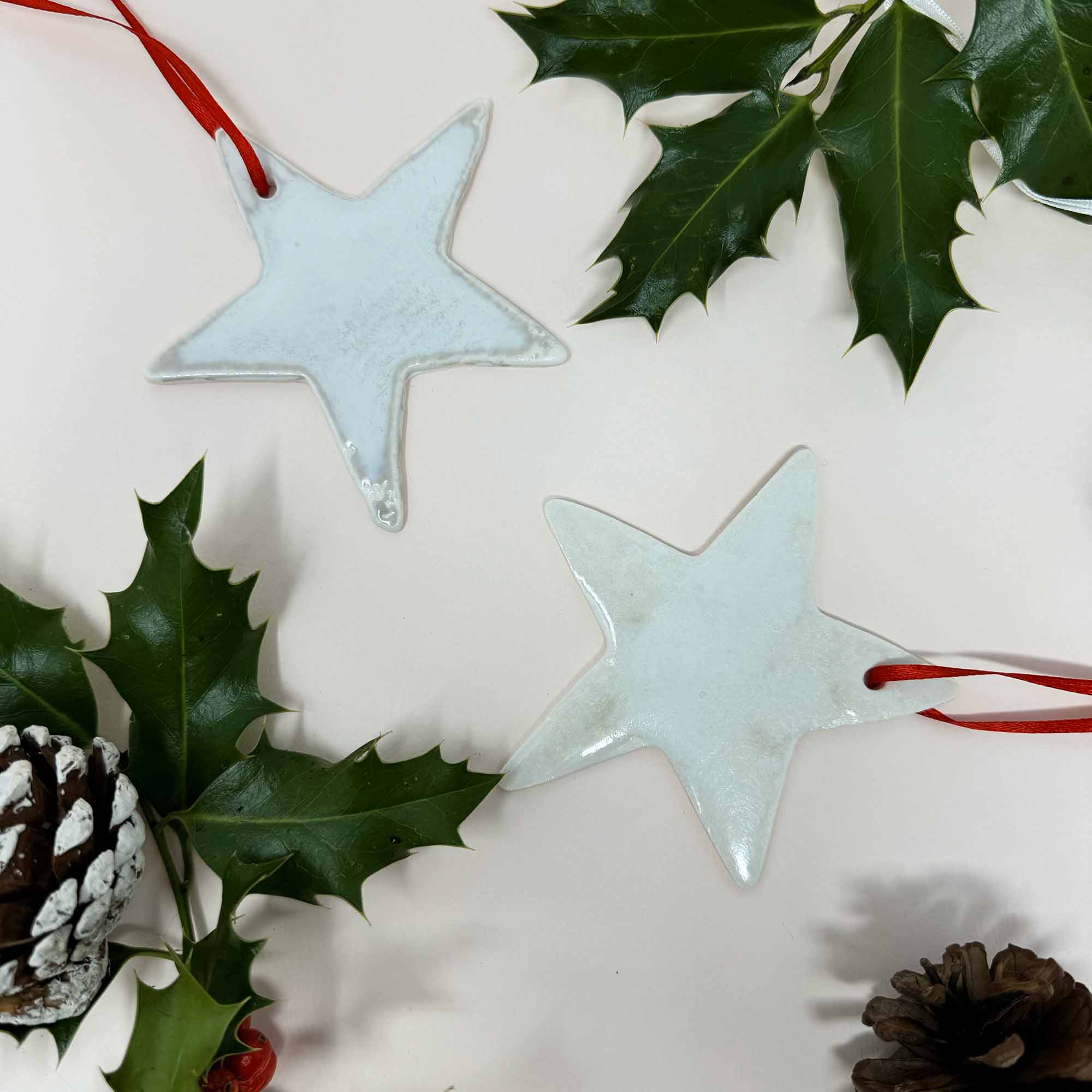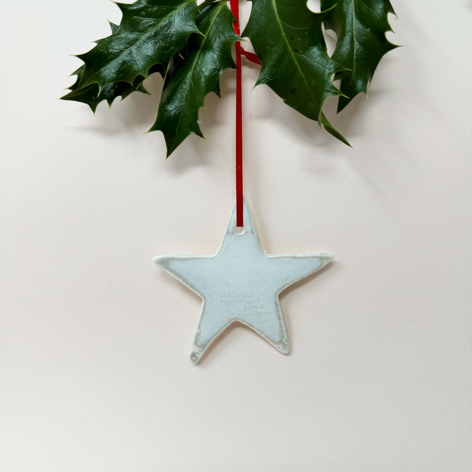 Each star has been handmade with porcelain, and beautifully finished with a pearl glaze. A beautiful handmade Chistmas decoration that makes a special Christmas keepsake.