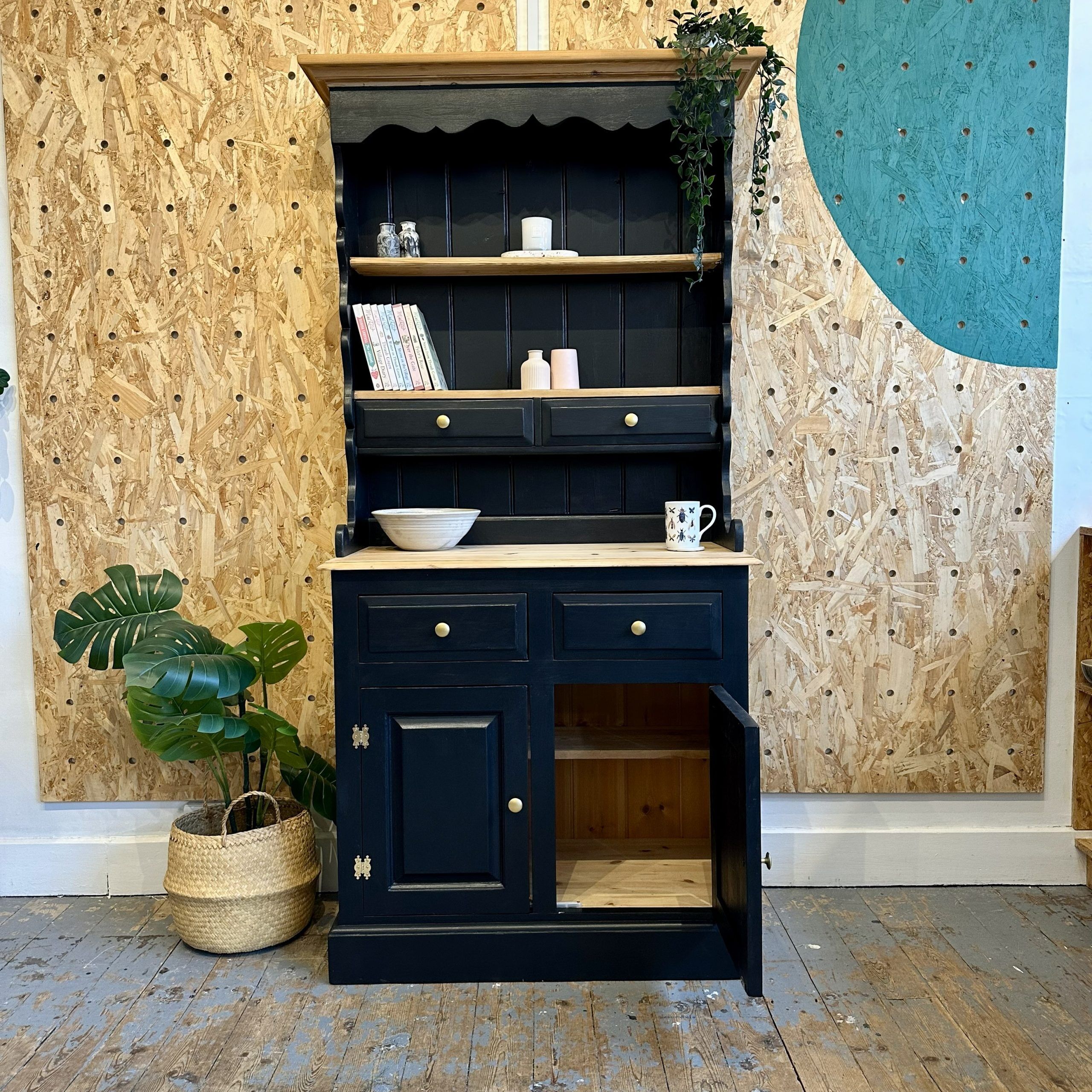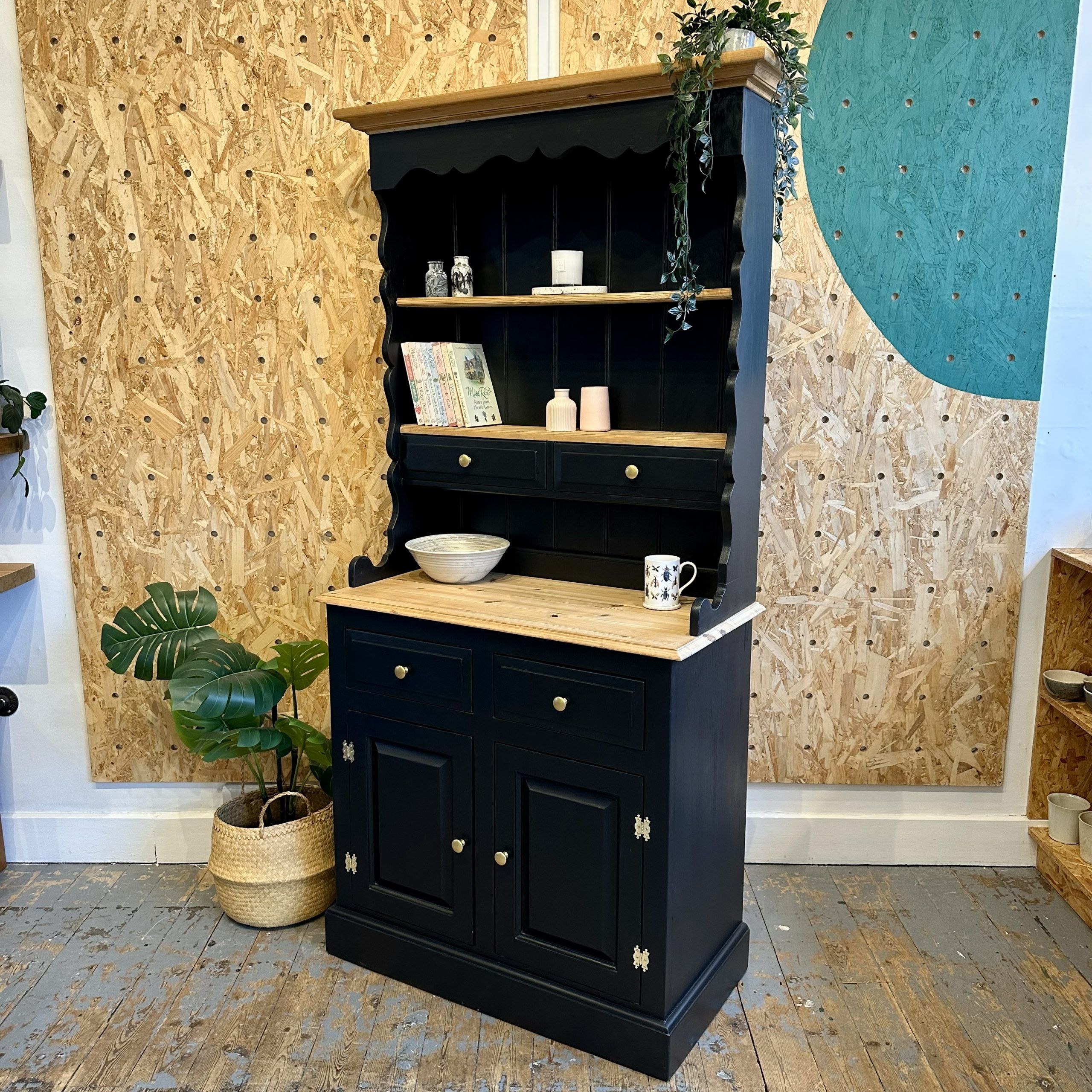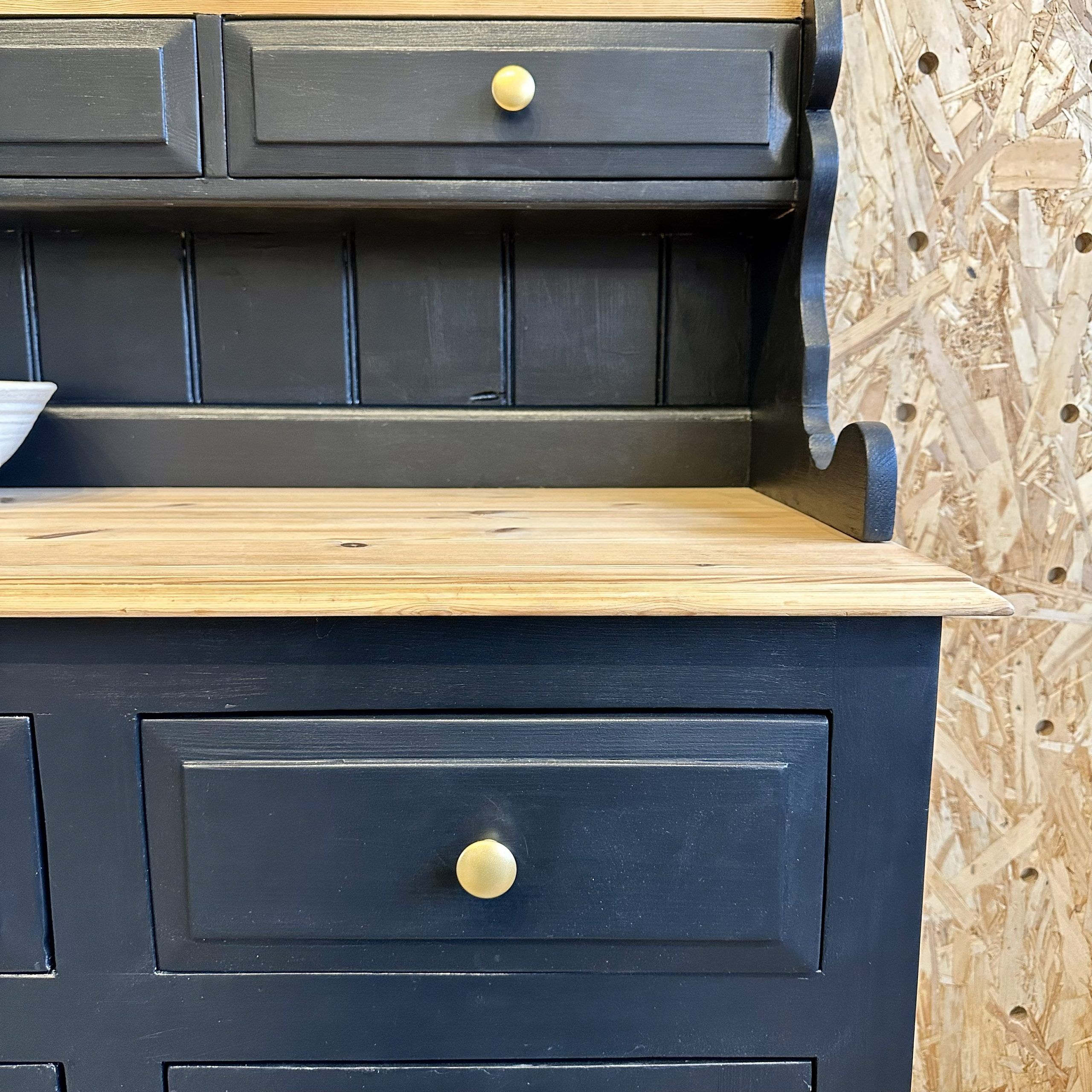 This is a beautiful, classic Welsh dresser that has been expertly refinished to blend traditional charm with a modern, sophisticated aesthetic. Painted in a deep, rich black (an attractive satin finish) and contrasted with natural, sanded wood surfaces, this piece makes a magnificent statement. Perfect for a kitchen, dining room, or living area, offering both stylish display and ample storage.