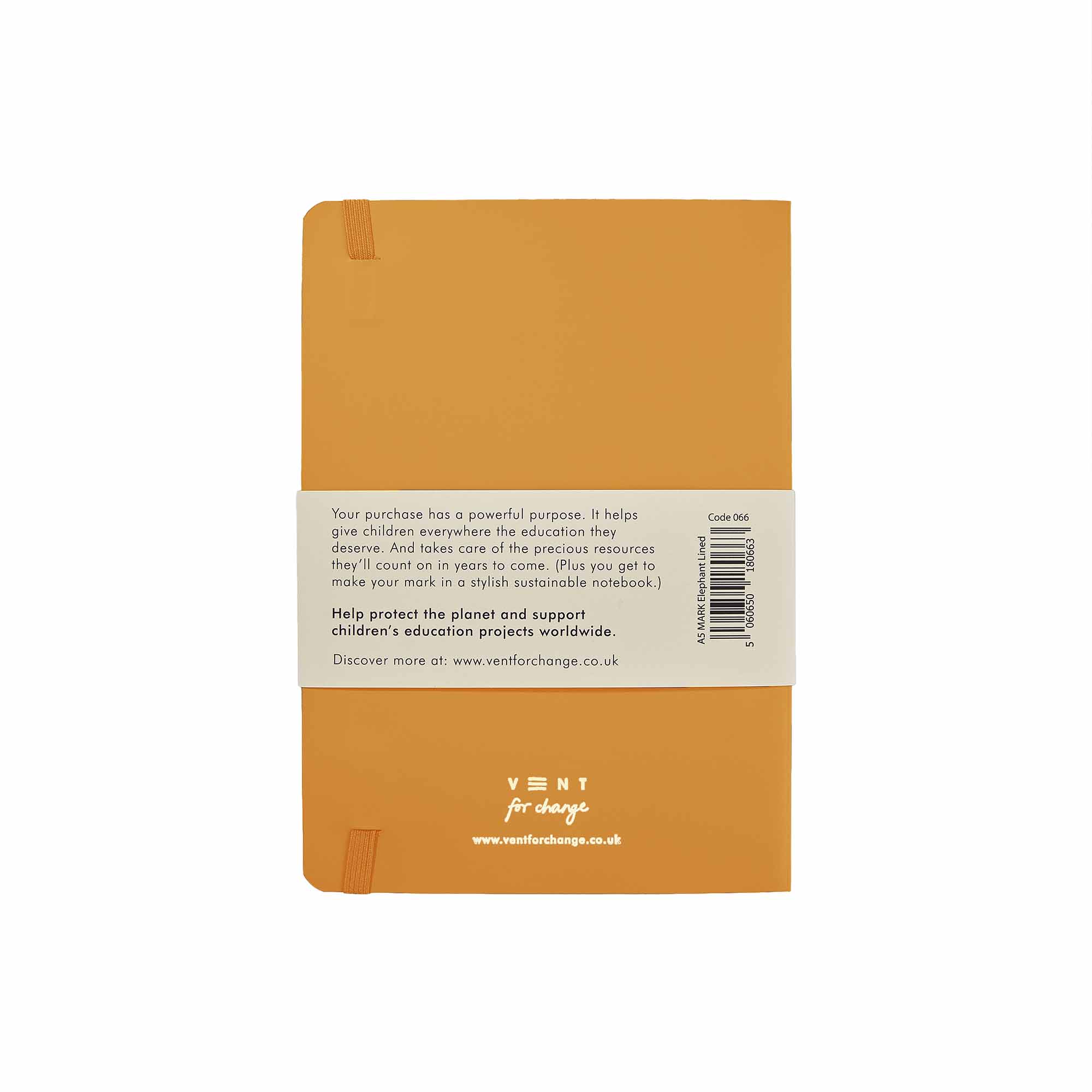 A5 notebook from VENT for Change with a tactile and semi rigid recycled leather cover in stylish mustard yellow.