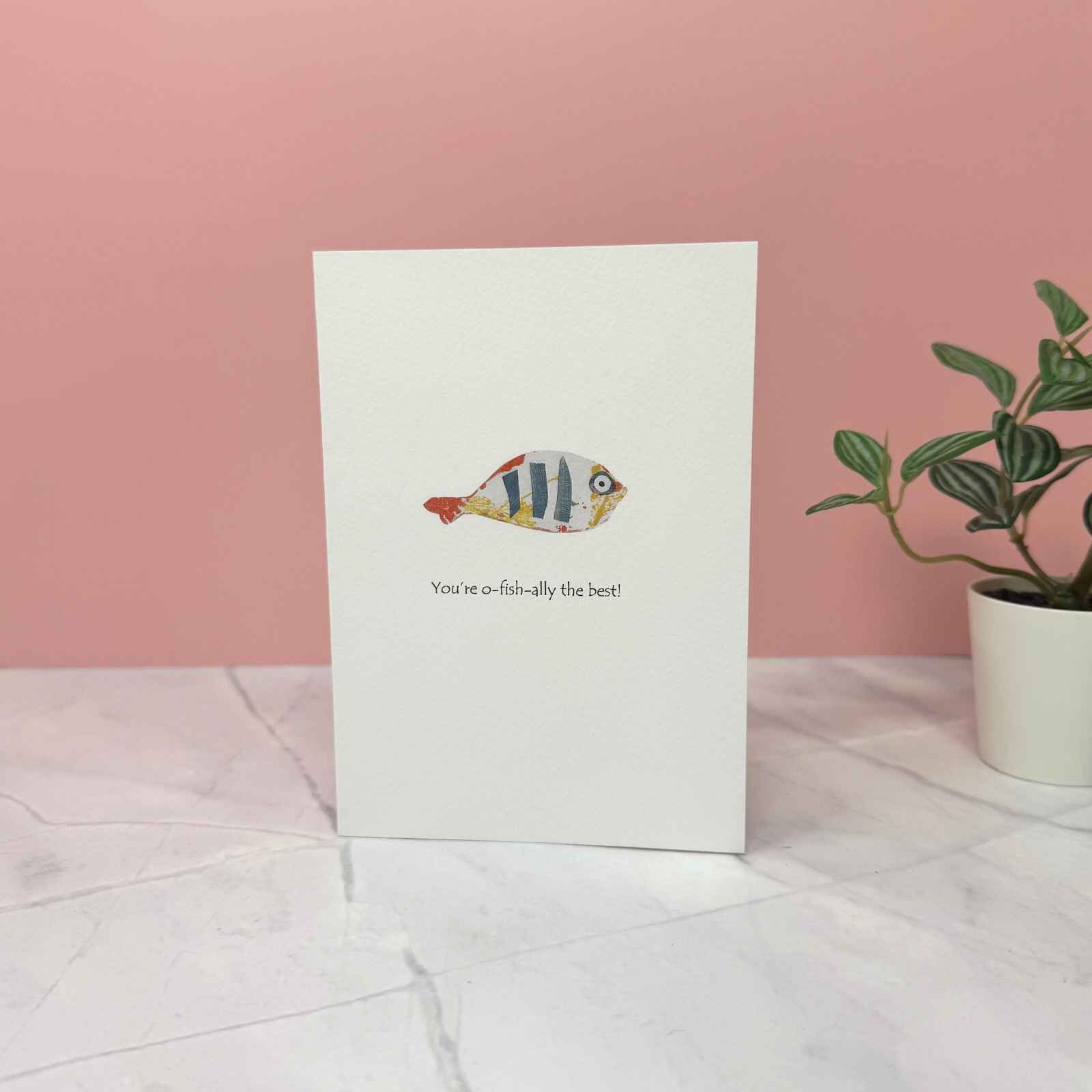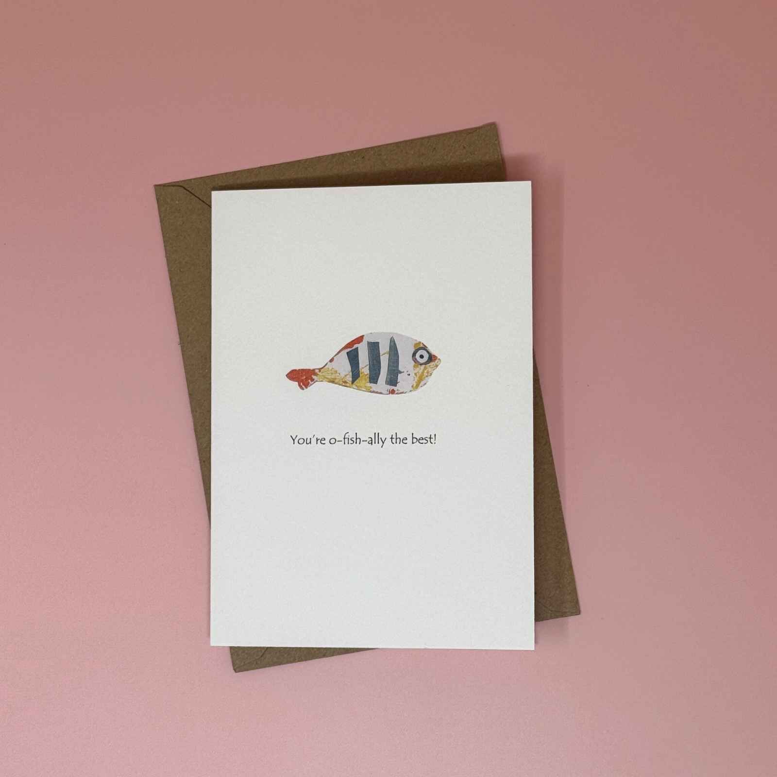 A beautiful greetings card with insect motif and playful message, ‘You’re O-Fish-Ally The Best’. All our cards are hand-illustrated by adults with learning disabilities at our parent organisation, Nickel Support during art sessions.