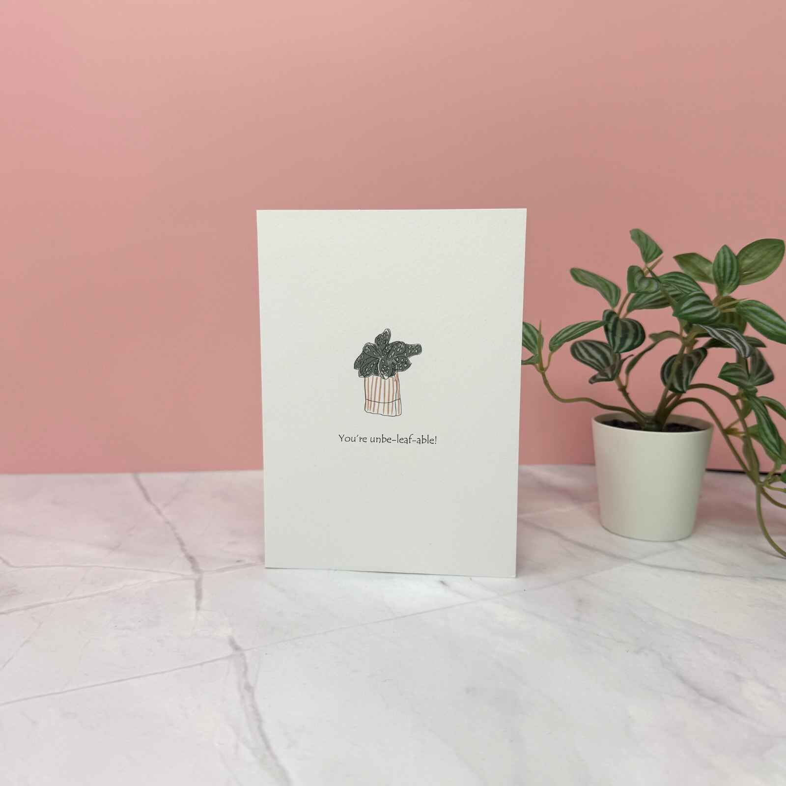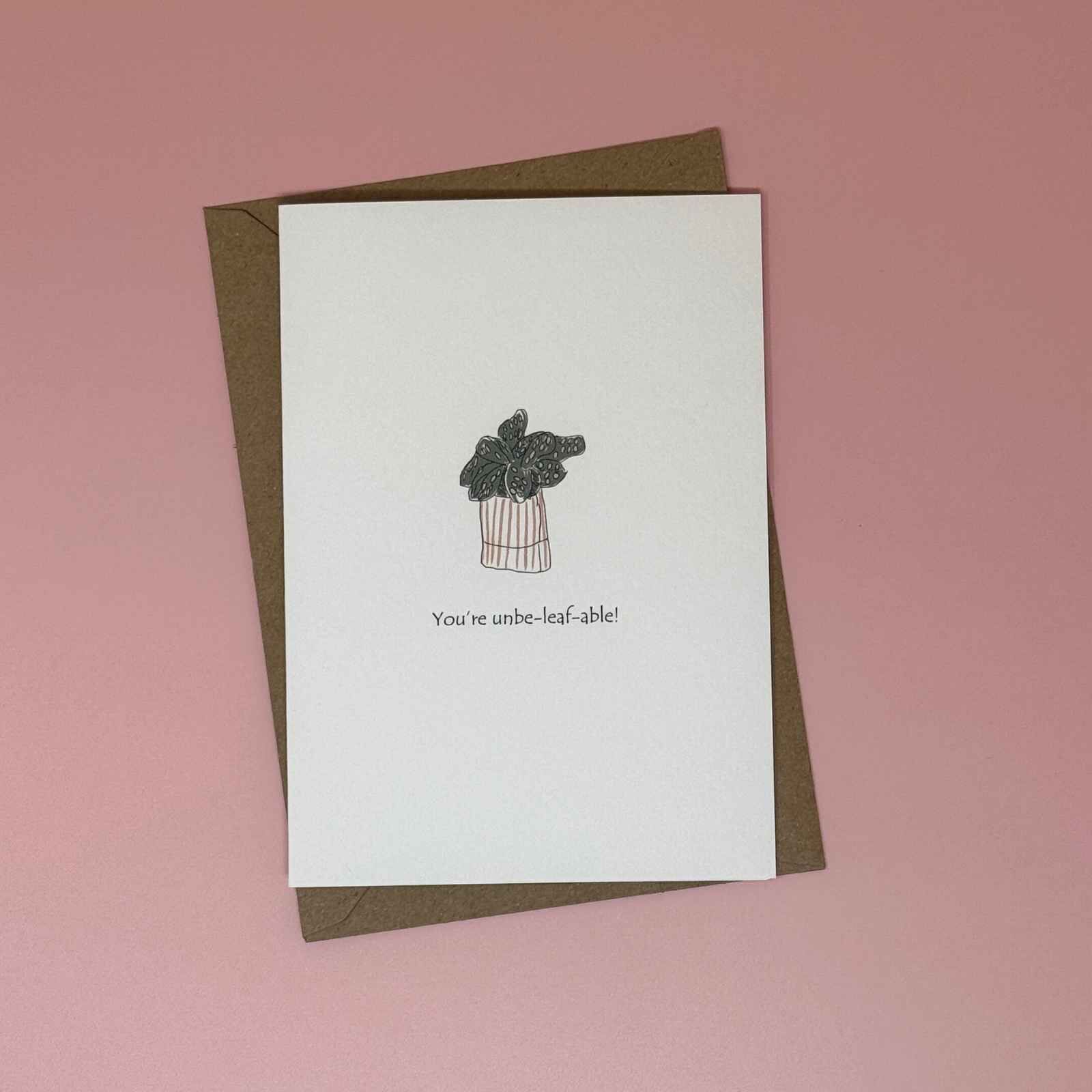 A beautiful greetings card with plant motif and playful message, ‘You’re Un-be-leaf-able’. All our cards are hand-illustrated by adults with learning disabilities at our parent organisation, Nickel Support during art sessions.